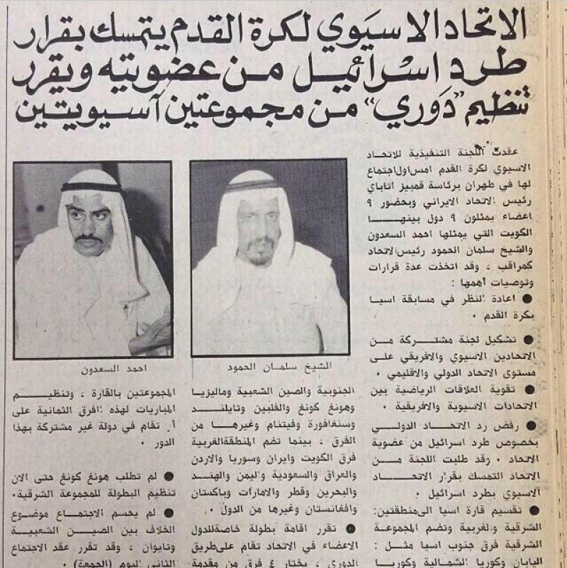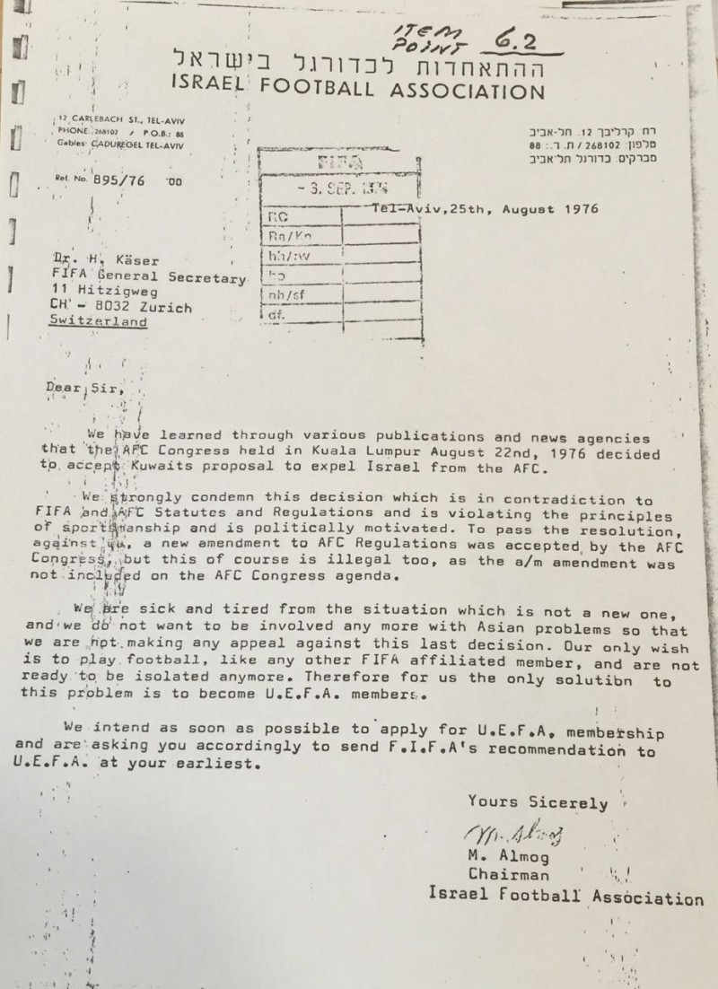 صورة برقية اتحاد كرة القدم في الكيان الصهيوني موجهه الى الاتحاد الدولي لكرة القدم (فيفا) يحتج فيها على قرار الطرد من الإتحاد الآسيوي ويطلب انضمامه الى الاتحاد الاوروبي لكرة القدم بتاريخ ١٩٧٦_