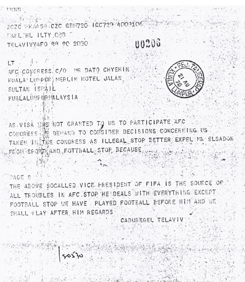 صورة برقية اتحاد كرة القدم في الكيان الصهيوني التي يحتج فيها على عدم منح مندوب عنه لحضور مؤتمر كوالالمبور ١٩٧٦_٨_٢٢