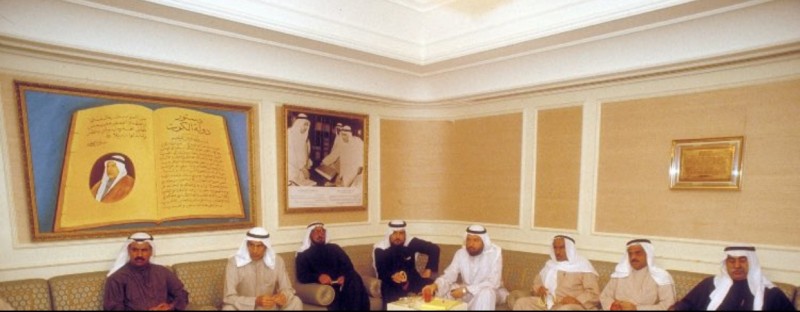 اجتماع في ديوان السعدون بالخالدية في ١ مارس ١٩٩٠ من اليمين: د. يعقوب حياتي، عبدالعزيز المطوع، حمود الرومي، أحمد باقر، جاسم العون، عباس المناور، أحمد السعدون، صالح الفضالة